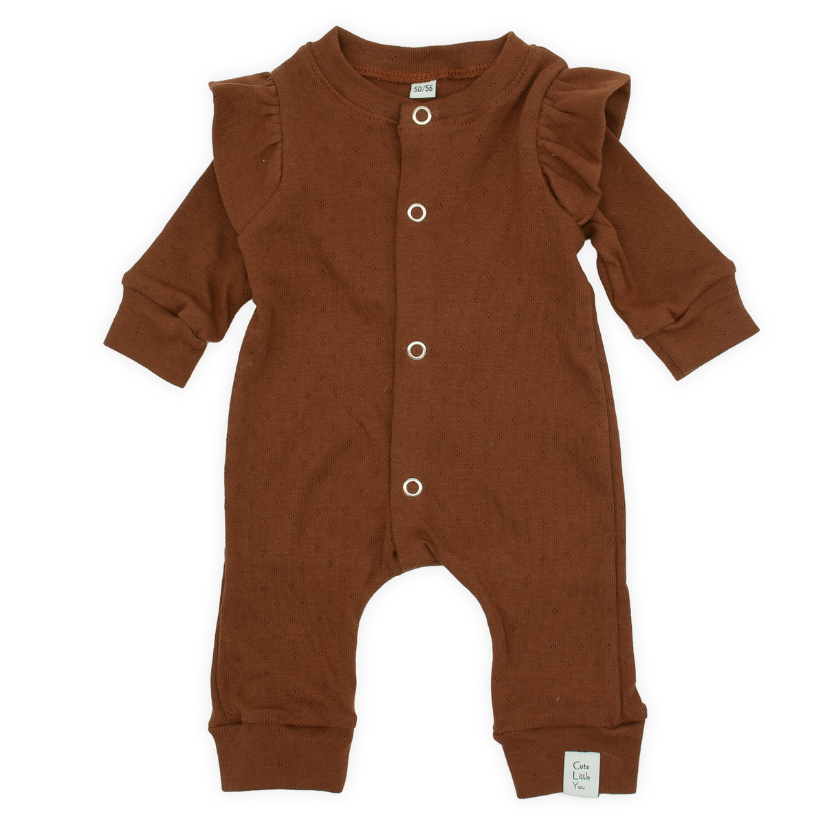 Dit lieve katoenen boxpakje in een warme bruintint is een must-have voor de allerkleinste. Het is gemaakt van zachte ajourstof, die zorgt voor een subtiel patroon en extra comfort. De ruches op de schouders geven het pakje een speelse, stijlvolle uitstraling. Dankzij de handige drukknoopsluiting aan de voorkant is aan- en uitkleden een fluitje van een cent.